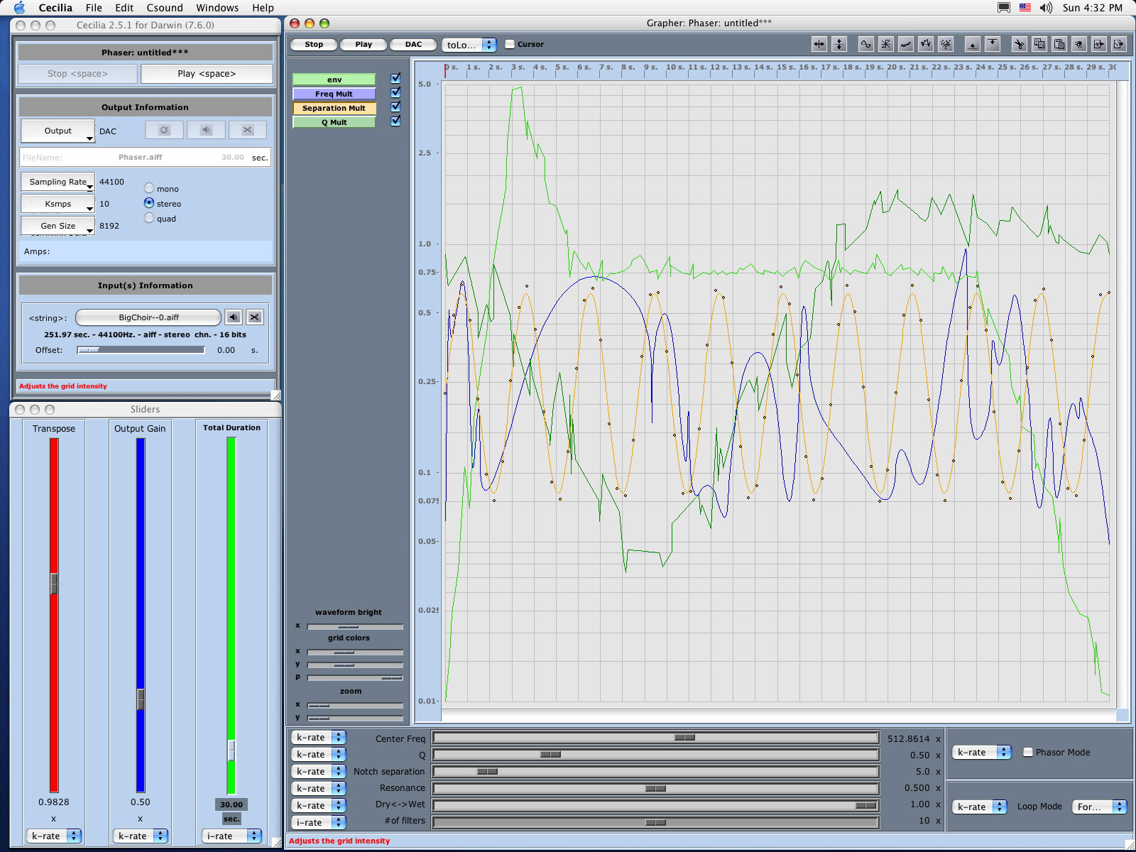 Cecilia serves the composer with little programming experience and the programmer with little composing experience. There is very little, sound wise, that cannot be done with Cecilia. Cecilia operates on top of Csound, the audio/dsp engine from Barry Vercoe at MIT.