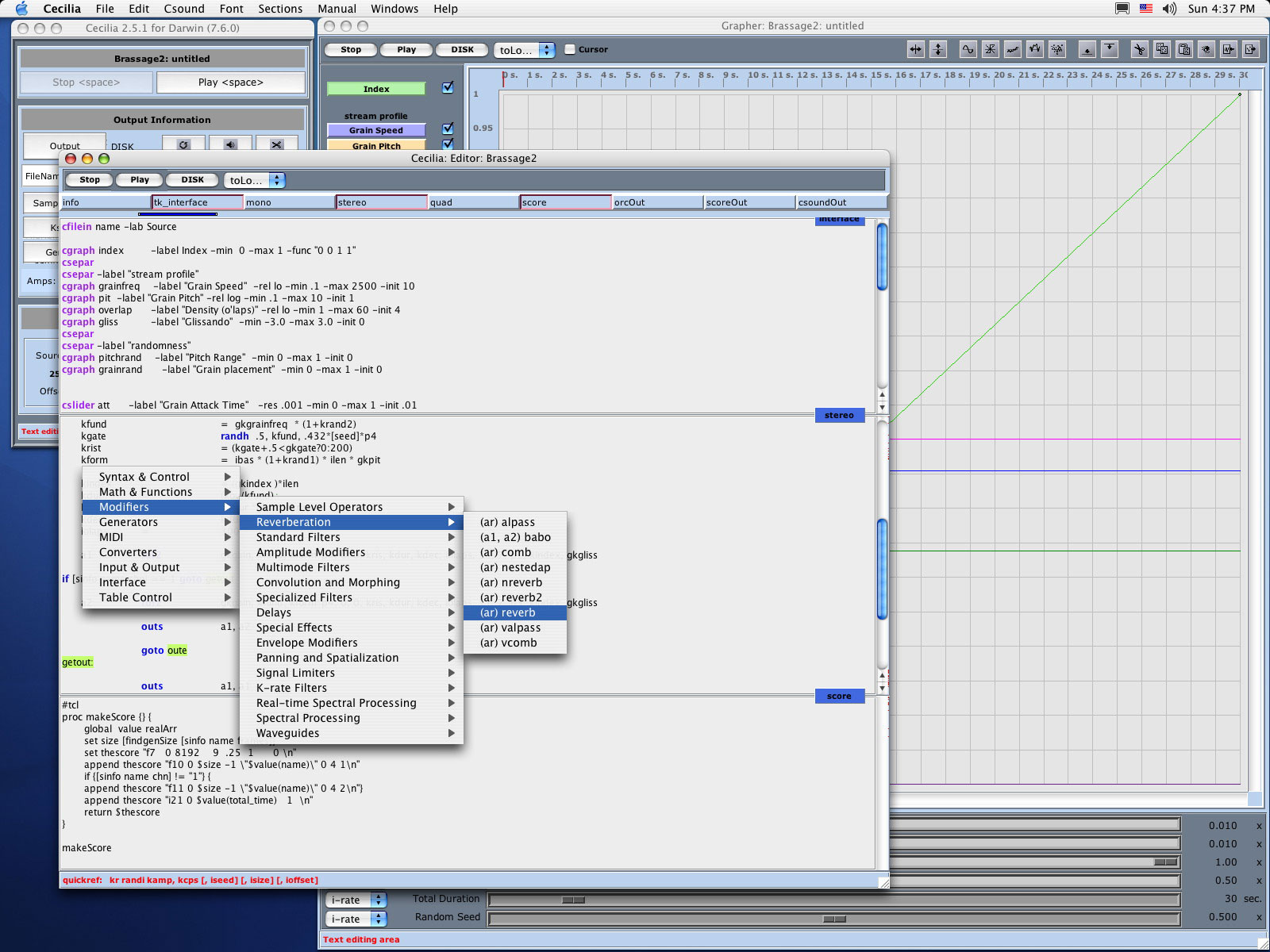 Cecilia also contains a powerful score generation language called Cybil. It draws ancestry to CCRMA's Score program by Leland Smith. This is an area in Cecilia that bares exploring. There are wonderful algorithms to be found. All of Cecilia is constructed in tcl/tk, a slow yet appropriate scripting language as Cecilia does no audio computations.